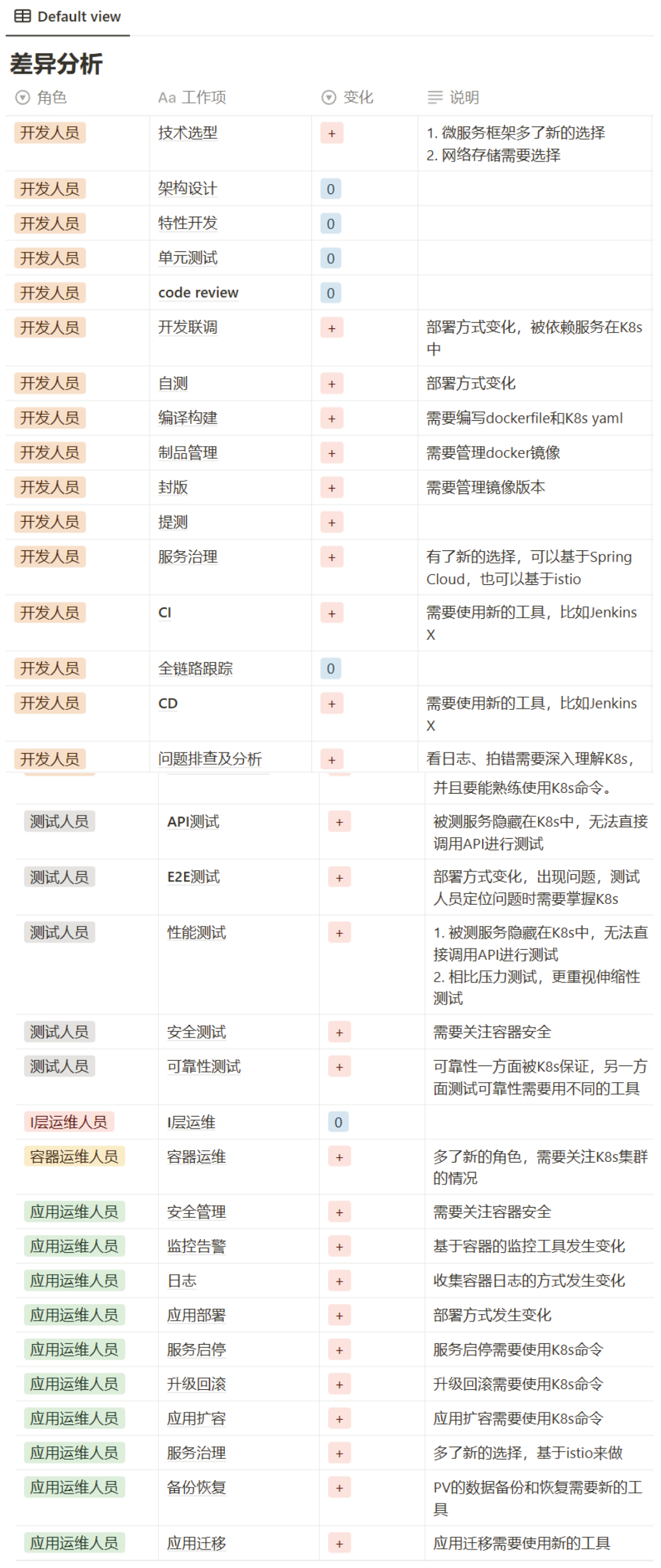 人员分工是指不需要整个团队的人都懂K8s,只需要特定的一两个人懂K8s,研发人员、测试人员只需配合相关的工作,由这一两个人来编写Dockerfile、K8s yaml,也可以由这一两个人写好脚本,开发人员和测试人员直接调用脚本,传递合适参数。